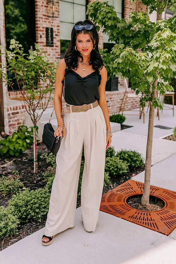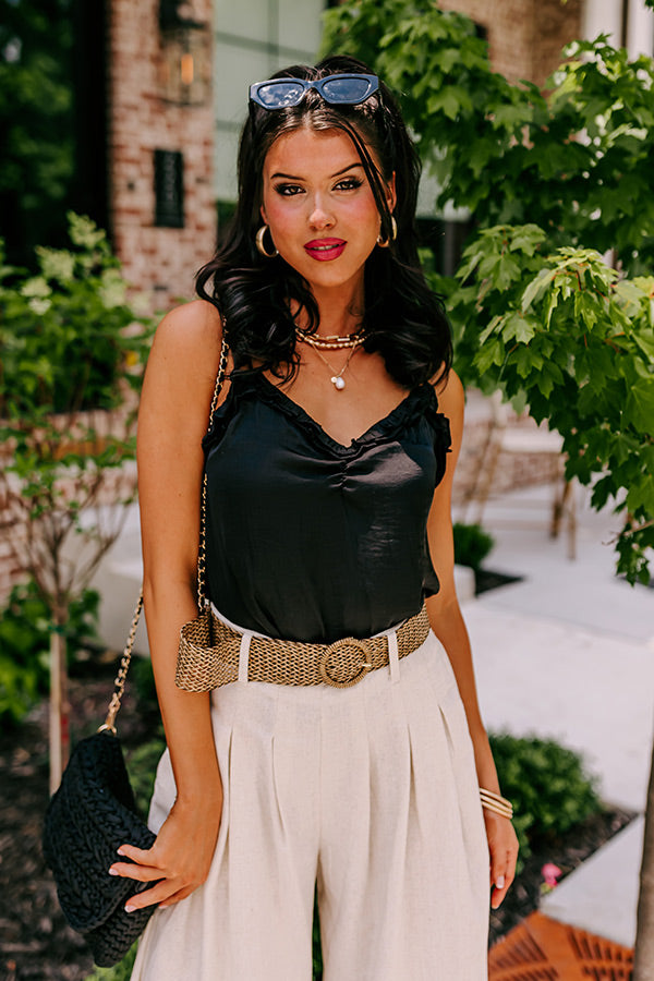 Our favorite new basic just landed! You are sure to be ADDICTED to this basic black shift tank featuring sleek lightweight material, a v-cut neckline, ruffled trim detailing, adjustable spaghetti straps, a low cut open back, and a relaxed silhouette that falls into a straight hemline! You can style this piece with some distressed ankle skinnies and a black bootie and faux suede hat, or you can wear it under our "Chai Latte Cuddles Knit Cardigan in Grey" with our Weekend In NYC Ribbed Velour Skirt in Ecru Olive," our "NYC Destiny Snake Print Tote," and "The Seraphina Faux Leather Wedge in Grey!"