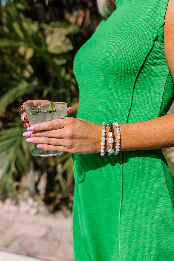 – Lightweight stretch bracelets with a variety of gold, white, and green hued beads