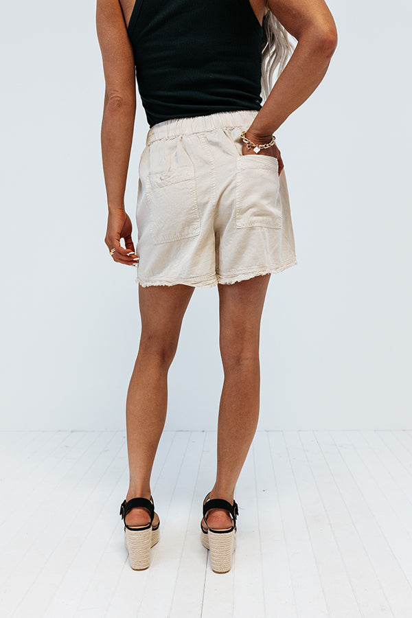 Stay neutral in our cute beige colored 'Afternoon Sail' shorts featuring lightweight material, a high waistline with a tie closure, two accent side pockets and back pockets, and a relaxed silhouette that ends in frayed upper-thigh length hemlines!