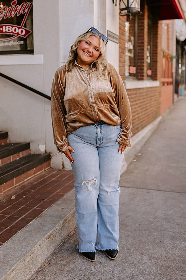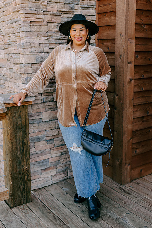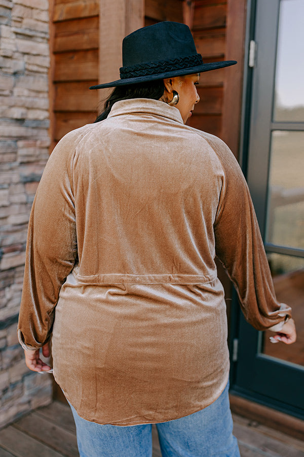 Fall is in the air! Layer up in luxury with our 'Apple Cider Sips' velvet jacket featuring soft, lightweight mocha colored velvet, collar, button up closure, two large side pockets, long loose sleeves with button cuffs, and a loose fit that falls to a rounded front hemline.