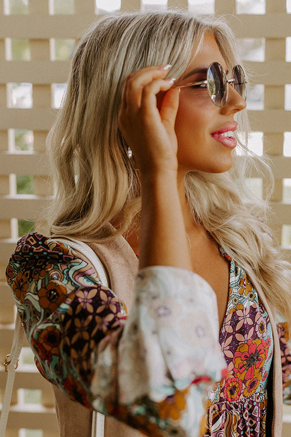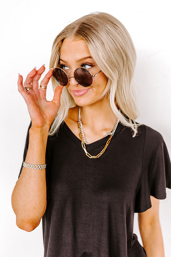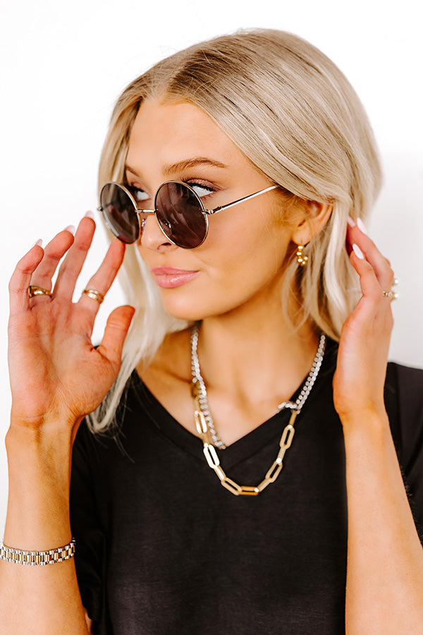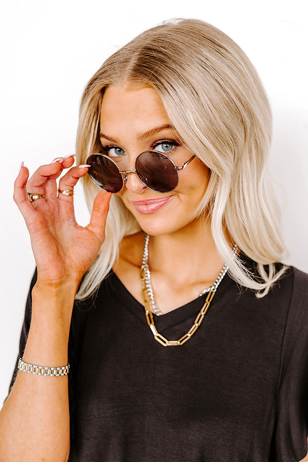 Add a groovy addition to your look with our cute 'Around We Go Sunnies' featuring silver circle frames with dark tinted lenses!