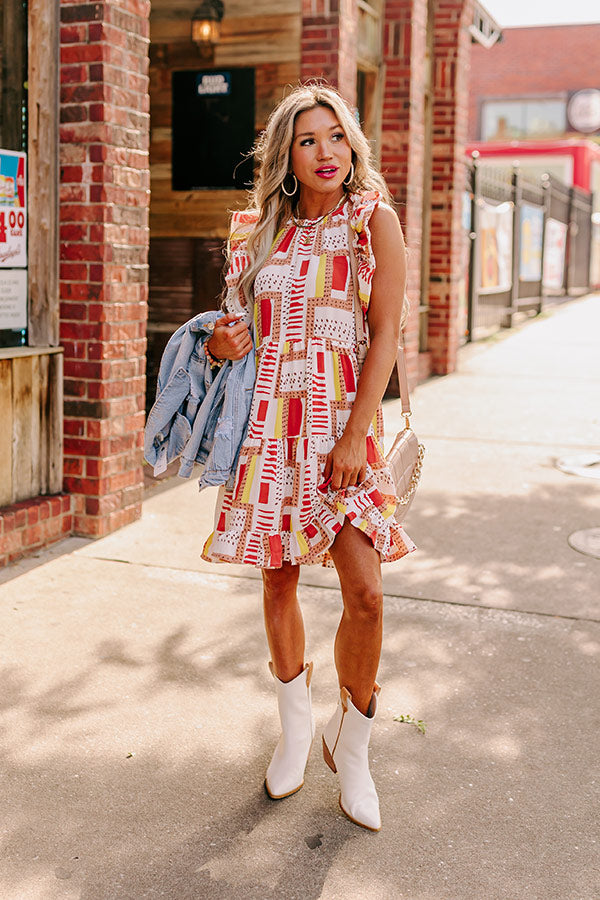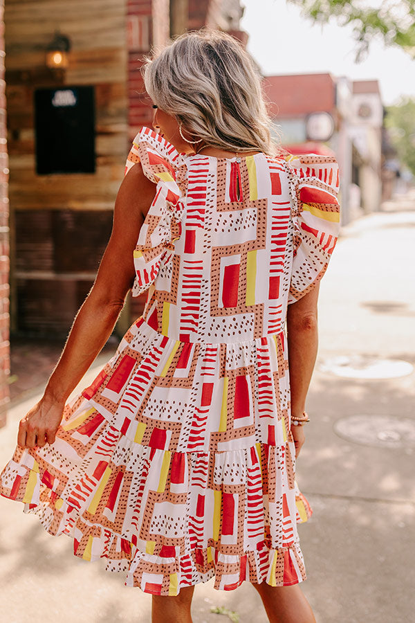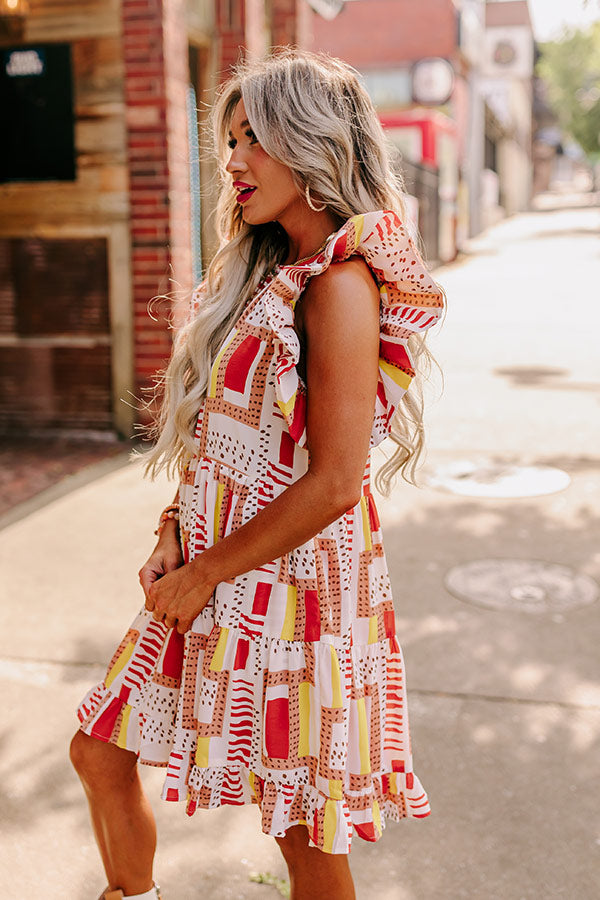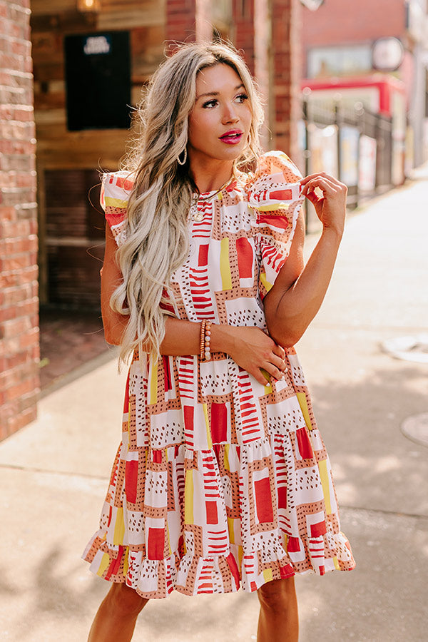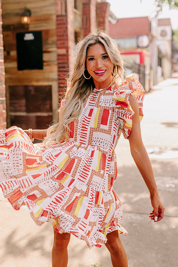 - Lightweight material with a yellow, orange, and brown hued abstract print and a built-in skirt lining