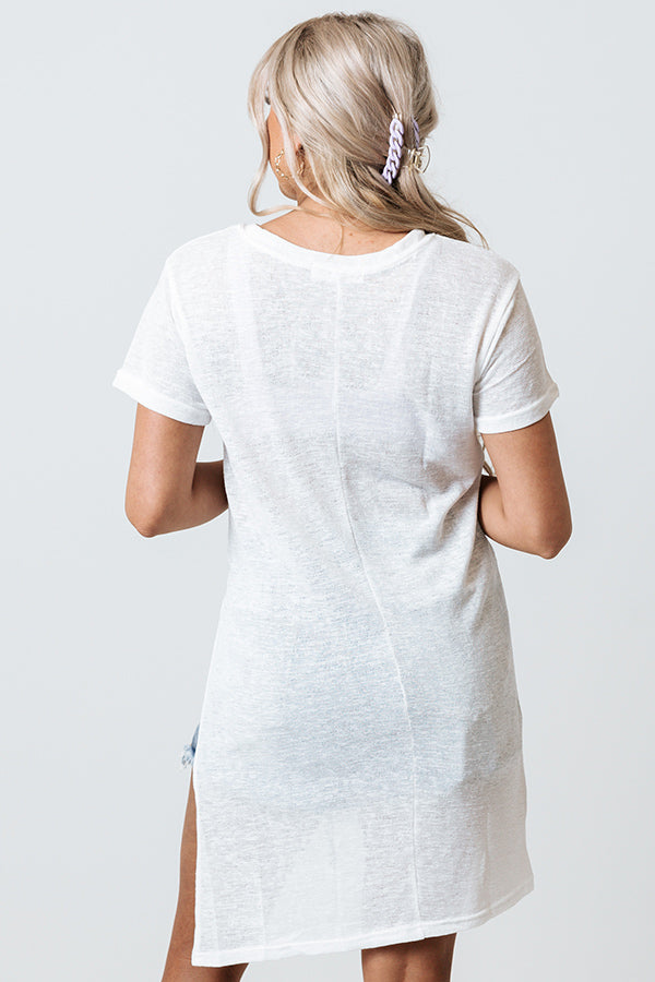 There is no better way to stay cool this summer than with our versatile white 'Baja Surf' tunic featuring ultra lightweight loose knit material, a high rounded neckline, short sleeves, and a flattering silhouette that falls into a straight mid-thigh length hemline with high accent side slits! Wear with your fave denim shorts or over a chic swimsuit!