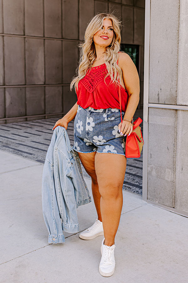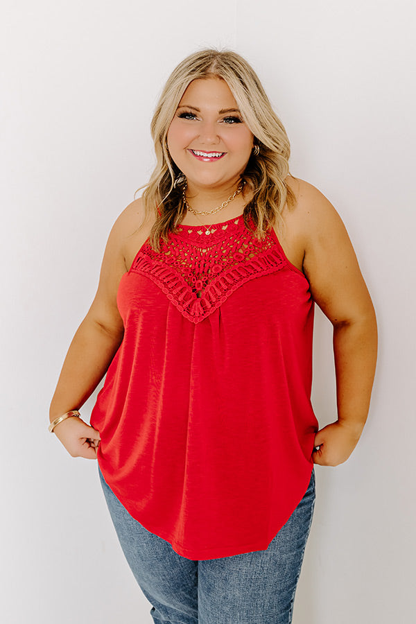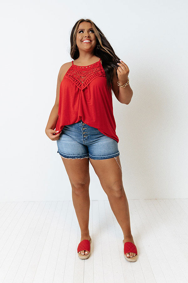 Upgrade your wardrobe basics with our adorable red plus size 'Beachy Bonding Shift Tank' featuring lightweight material with intricate crochet detailing across the bodice, a rounded neckline with adjustable spaghetti straps, and a relaxed silhouette that falls into a straight hemline!