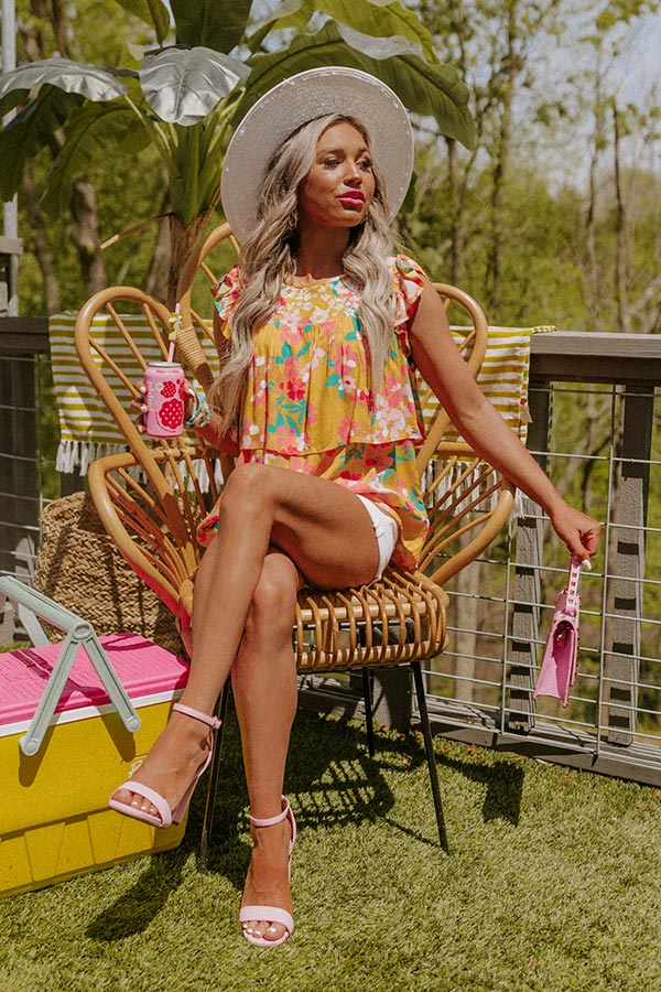 Let your beauty bloom in our pretty mustard hued shift top featuring lightweight material patterned with a red, light pink, white, and teal hued floral print, ruffled cap sleeves, a rounded neckline with delicate embroidered detailing, a keyhole accented upper back with a button closure, and a relaxed overlay silhouette that falls into a straight hemline! on products