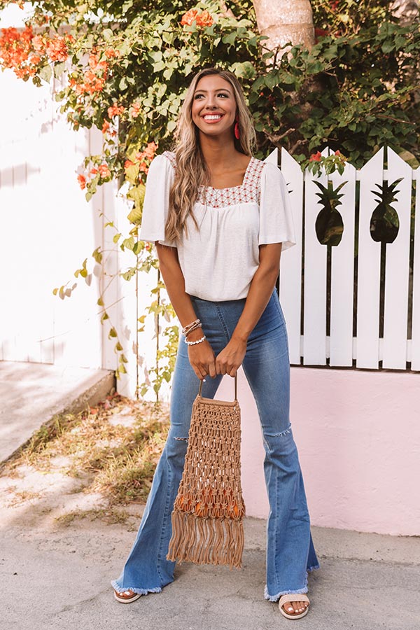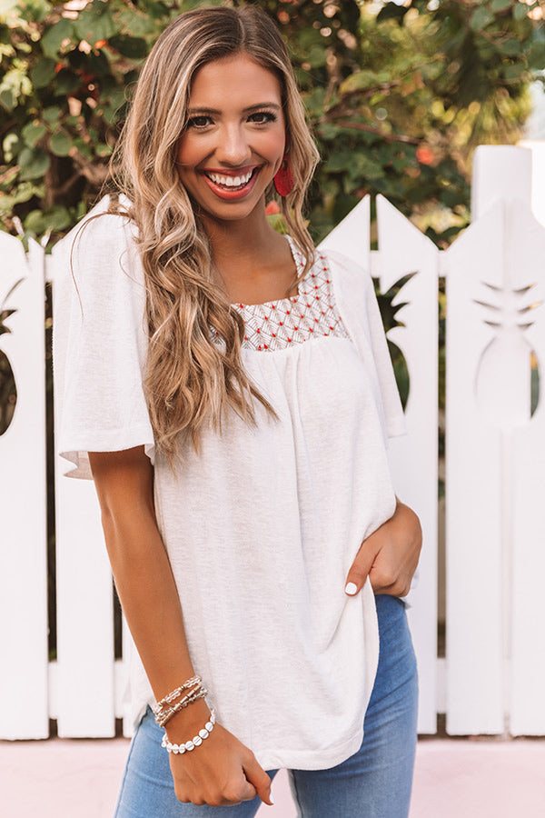 Our charming white "Best Chanced Shift Top" is a year round fave that will carry you from season to season with its lightweight breezy material, a square neckline and deep v-cut upper back with intricate red and neutral hued patterned trim, short loose sleeves, and a relaxed silhouette that falls into a straight hemline! This adorable piece styles perfectly with some light wash flares, neutral sandals, matching statement earrings, and a brown fringe crossbody, but you can also wear it with some distressed denim shorts, our "So Relatable Heel in Red," and "The City Life Felt Hat in Iced Latte!"