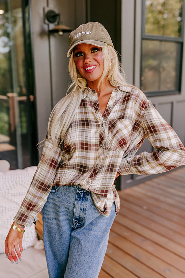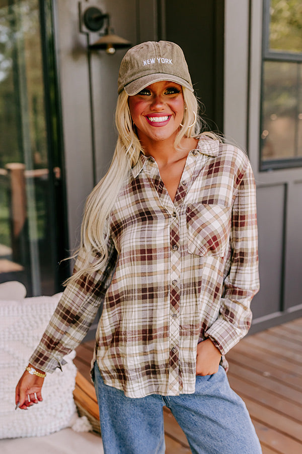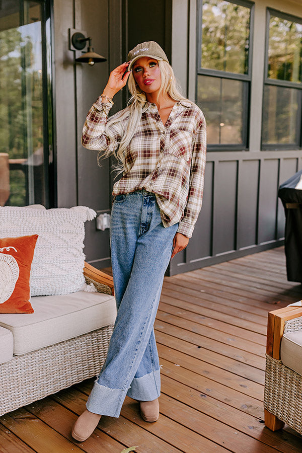 You will be looking cute around the bonfire when you arrive in this darling flannel featuring lightweight material patterned with a wine and olive hued plaid print, a button down front with a collared neckline, long loose sleeves with button closure cuffs, a single accent chest pocket, and a relaxed silhouette that falls into a rounded hemline!