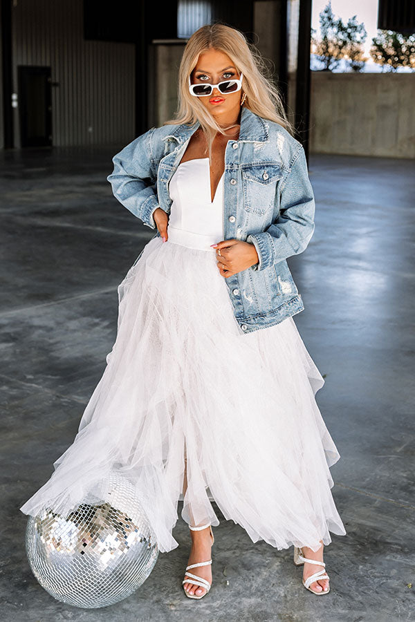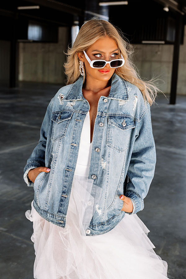 Add an edgy look to your elegant look with this trendy jacket featuring lightweight denim material with accent fading and distressed detailing, cute lettering across the shoulders, a button down front with a collared neckline, long loose sleeves with button closure cuffs, two chest pockets with flap closures and two side pockets, and a relaxed silhouette that ends in a straight hemline!