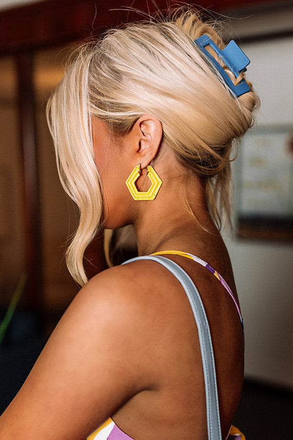 Add a pop of color to your look with our adorable 'Cabana Spot Earrings' featuring dangling yellow woven hexagon hoop!