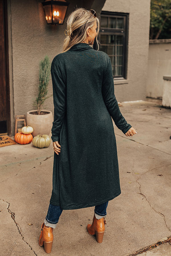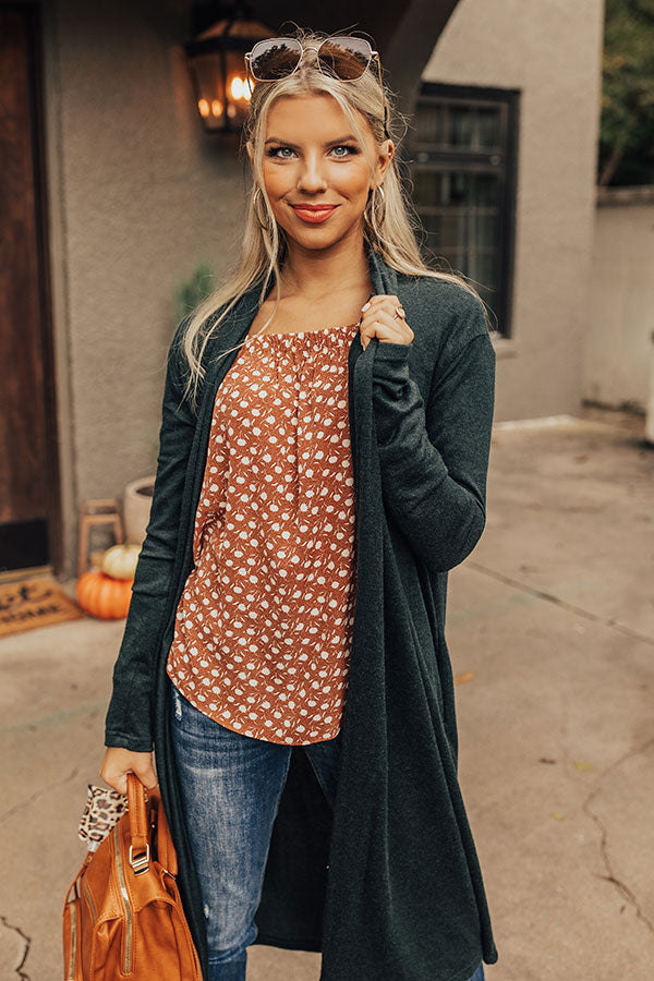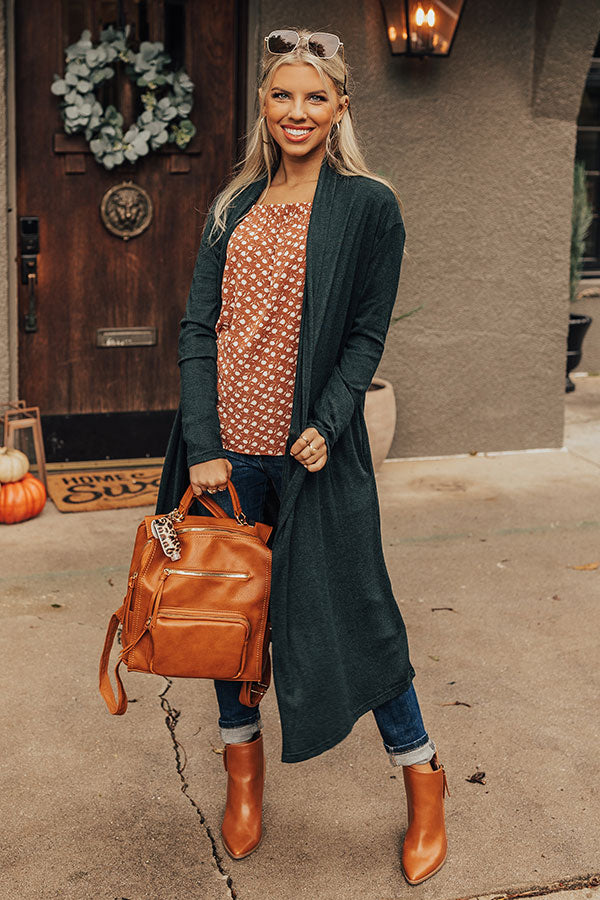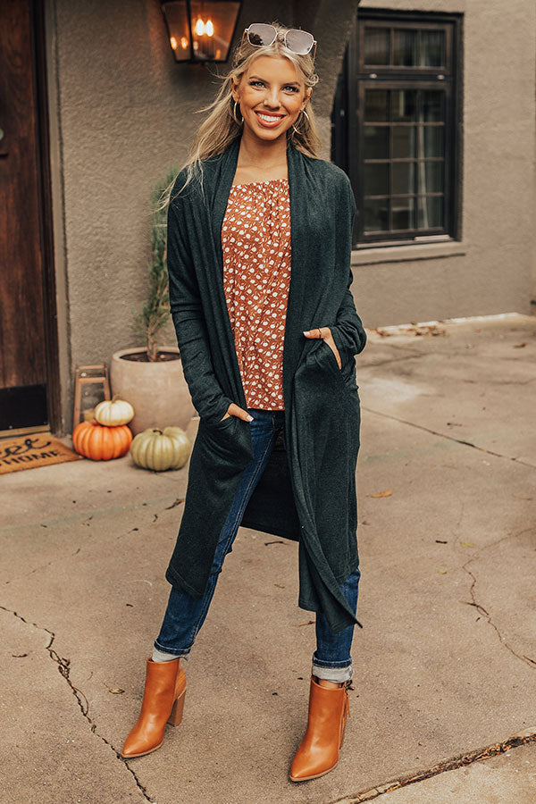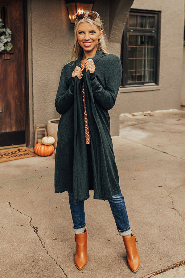 Drape yourself in style with our versatile forest colored 'Cafe On Braodway Cardigan' featuring lightweight but warm knit material, long loose sleeves, and a draped open front silhouette that cascades into a straight mid-calf length hemline!