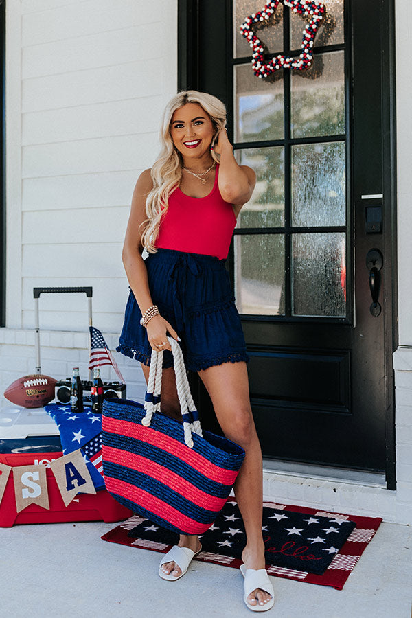 Coast into summer effortlessly with these adorable navy shorts featuring lightweight flowy material, a smocked waistline, a pom pom accent seam and trim, and a relaxed silhouette that falls into an uneven upper-thigh length hemline!