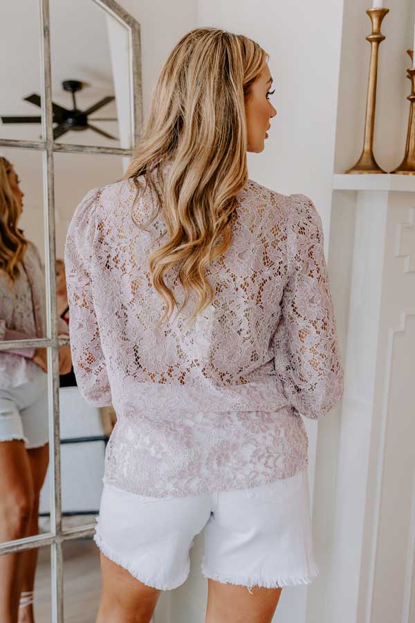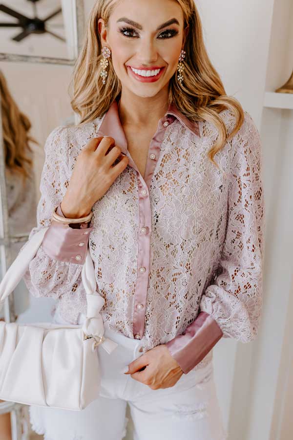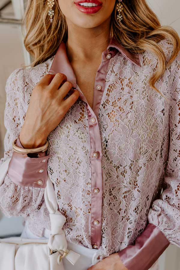 We have no doubt you will be caught up with how darling this top is featuring intricate white lace material with satin blush trim detailing, a pearl button up front with a collared neckline, long loose sleeves with button closure cuffs, and a relaxed silhouette that ends in a straight hemline!
