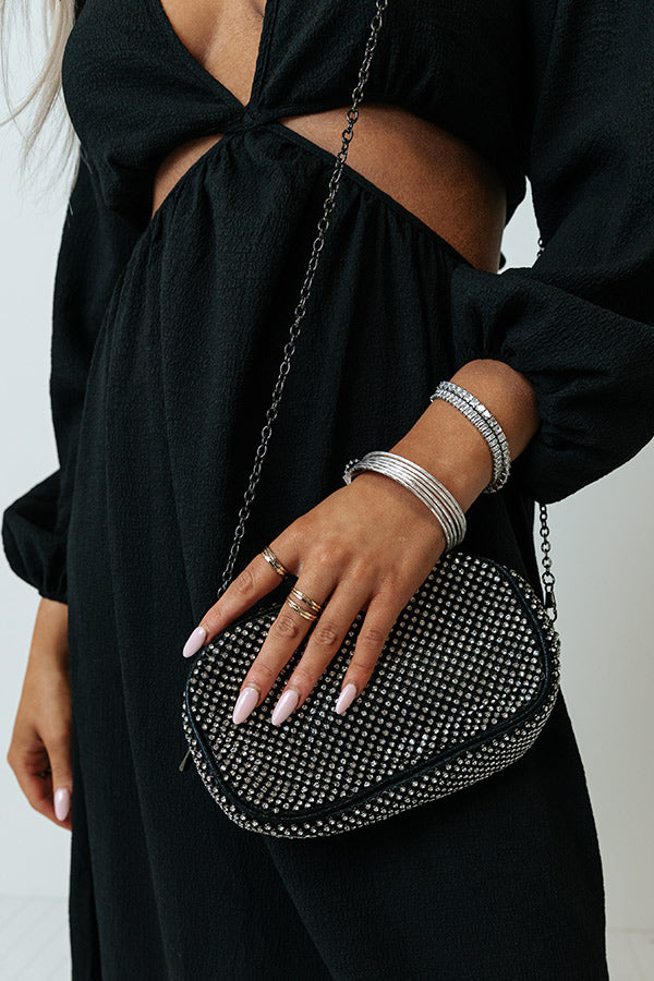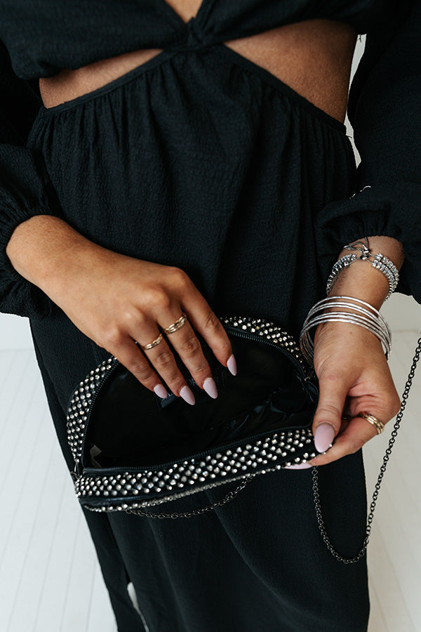 Add a glitzy flair to your look with our fabulous black 'Champagne Getaway' clutch featuring shimmering rhinestones, a chain link shoulder strap, and a spacious fully lined interior with a zip closure!