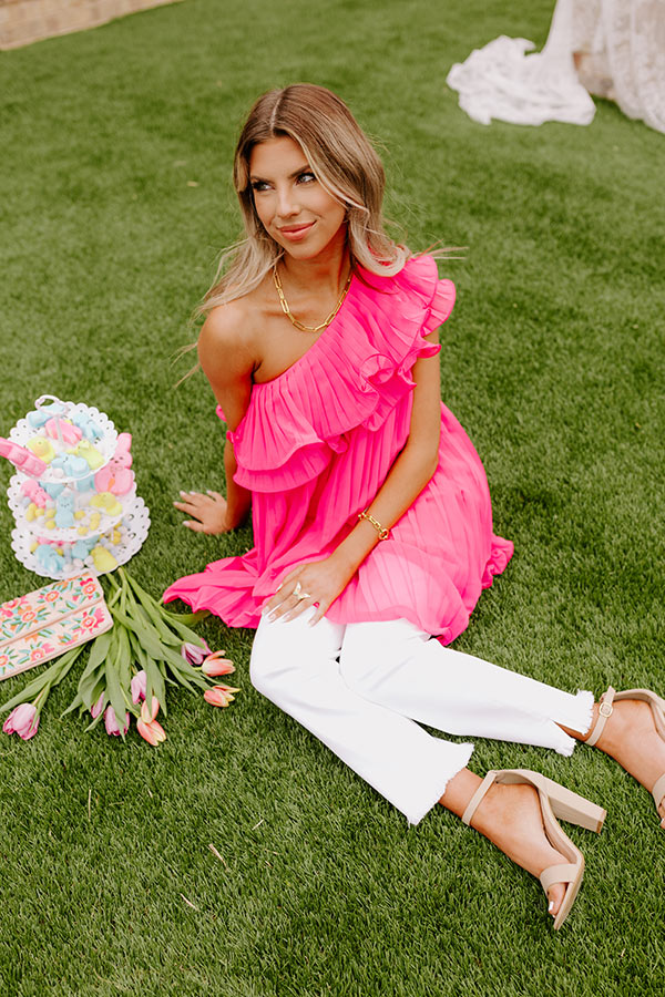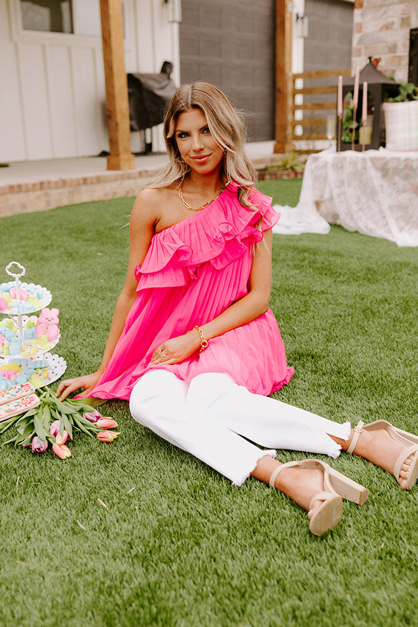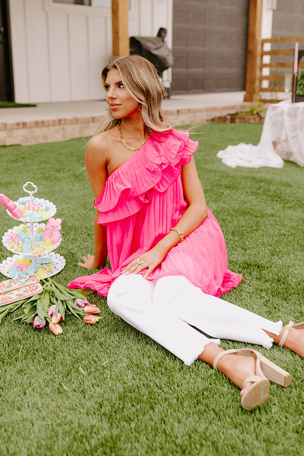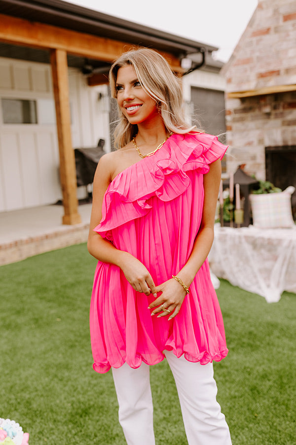 - A relaxed silhouette that ends in a pleated mid-thigh length hemline