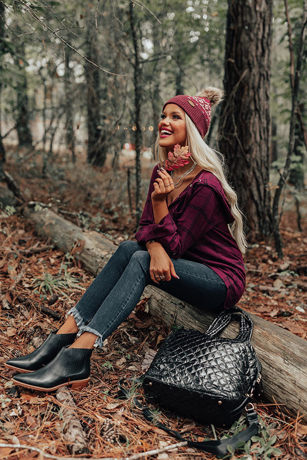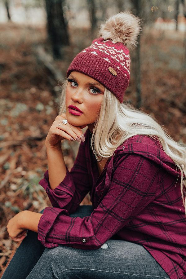 You are sure to be a cutie when you top off your OOTD with this darling maroon colored beanie featuring ultra soft lightweight stretchy tight knit material patterned with a unique aztec print, wide rolled trim with ribbed texturing, and a faux fur pompom beanie!