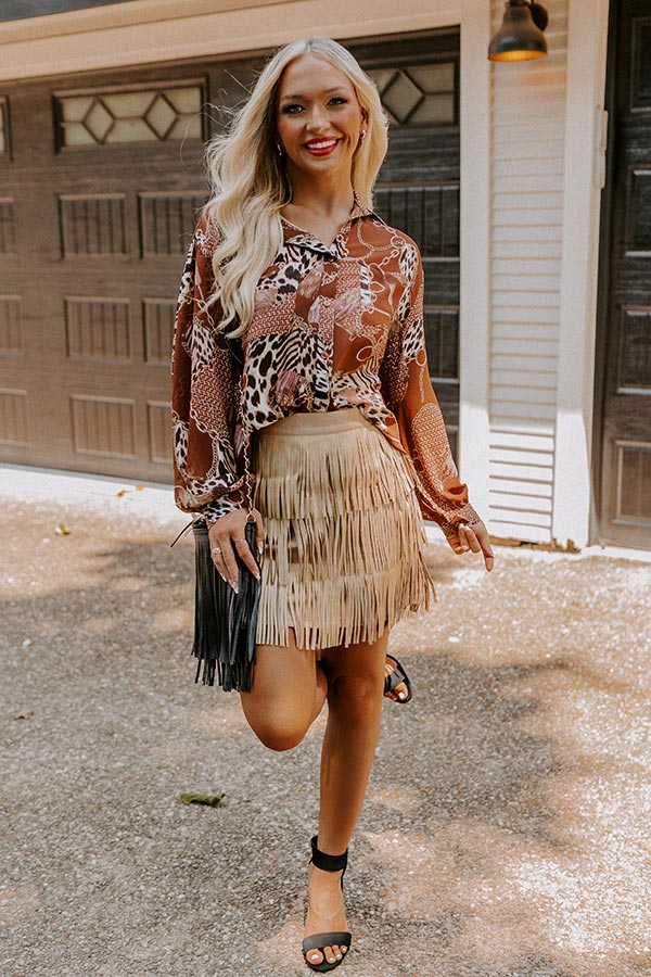 The perfect piece for twirling, our trendy gold 'Country Road' skirt featuring faux leather material with eye-catching fringe detailing, a high waistline, a side zip closure, and a flattering silhouette that ends in a straight mid-thigh length hemline!