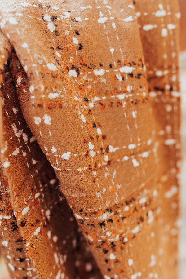 Be sure to feel the 'Cozy Cabin Vibes' this season with the perfect iced mocha colored scarf. Features a soft and lightweight knit material with black, white and orange detailing, and accent frayed trims.