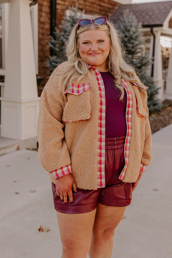 - Fully lined textured sherpa material with ivory and pink plaid accent material at the collar, cuffs, and pockets