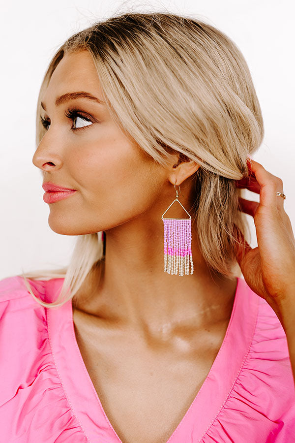 - A hook with dangling gold toned triangles and beaded fringe design featuring dusty purple, pink, and neutral hued beads