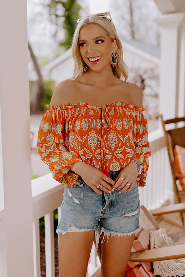 You are guaranteed to look dreamy in this adorable top featuring orange lightweight material patterned with a natural hued baroque print, a straight elastic off-shoulder neckline with a tie closure and long loose drop sleeves, and a slouched silhouette that ends in a straight hemline! on products