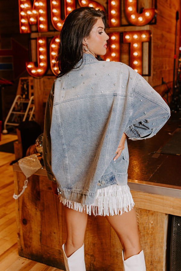 - Unlined, non-stretch denim material with accent fading and rhinestone embellishment