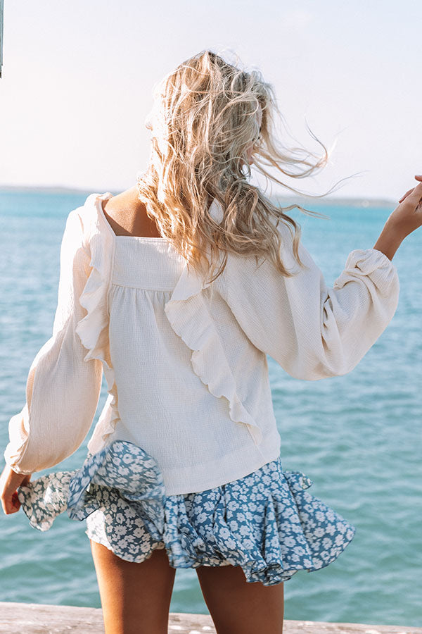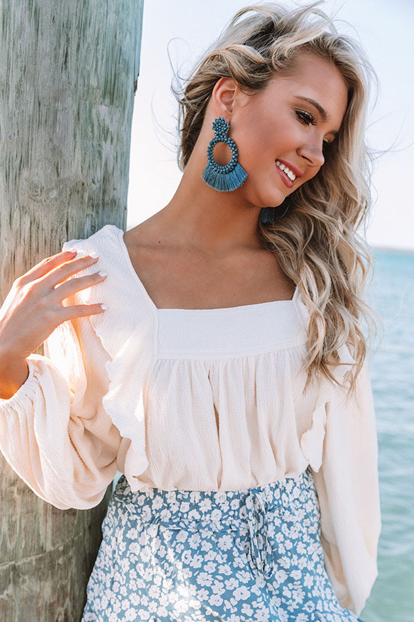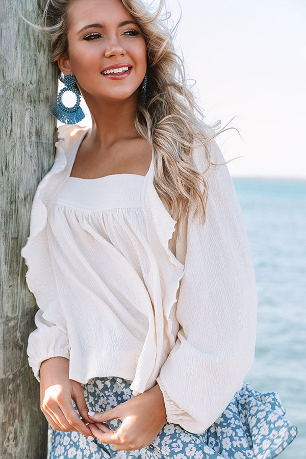 Be your own muse in our adorable cream hued "European Nights Shift Top" featuring lightweight breezy material, a square neckline and upper back, long bishop sleeves with fitted elastic banded cuffs, oversized ruffled accent seams, and a relaxed silhouette that falls into a straight hemline! This classic cutie styles perfectly with an airy blue floral skort and neutral platform heels, but you can also wear it with some distressed ankle skinnies, "The Avonlea Espadrille in Snake Print," our "Music City Snake Print Hair Scarf," and our "Neutral Territory Snake Print Tote in Black!"