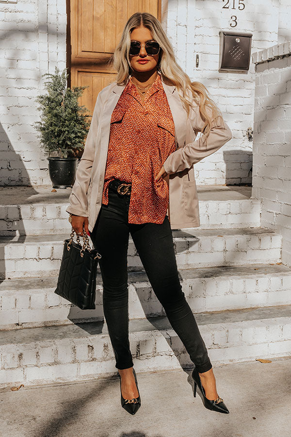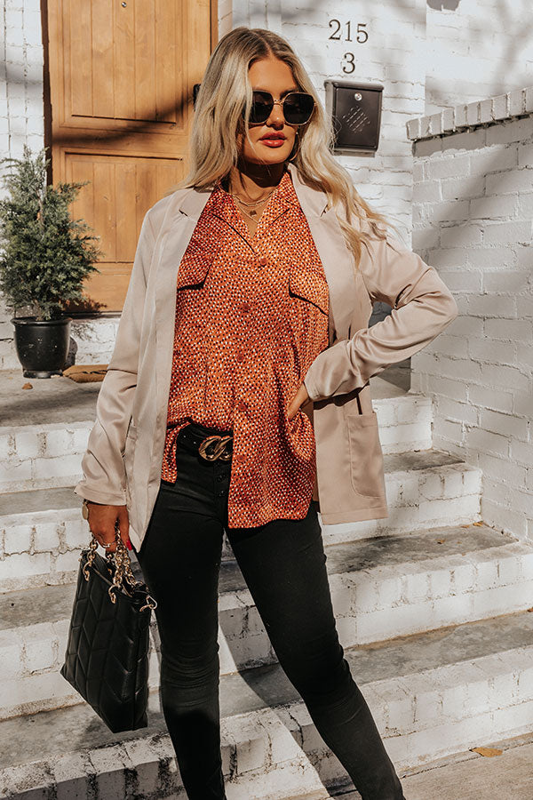 We have no doubt you will look extra fabulous in this pretty rust hued shift top featuring sleek lightweight material patterned with a subtle geometric spotted print, a button down front with a collared neckline, two chest pockets with flap closures, long loose sleeves with button closure cuffs, and a relaxed silhouette that falls into a rounded hemline!