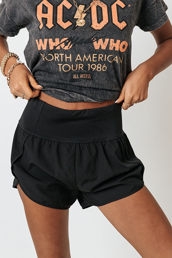 We have no doubt you will make it to the finish line in these sporty black shorts featuring lightweight material, a high stretchy waistline, sewn in biker shorts underneath, an accent pocket in the back with a zip closure, and a relaxed athletic silhouette that ends in straight upper-thigh length hemlines!