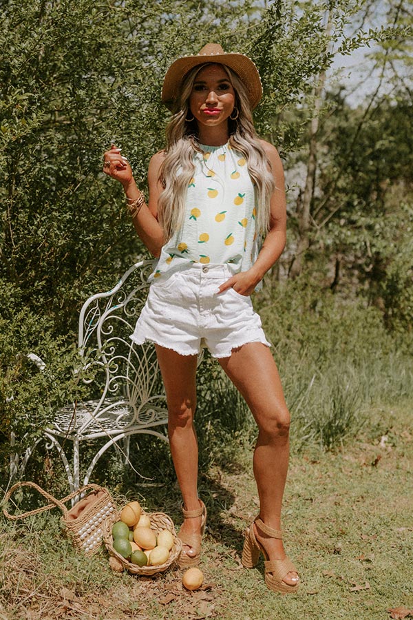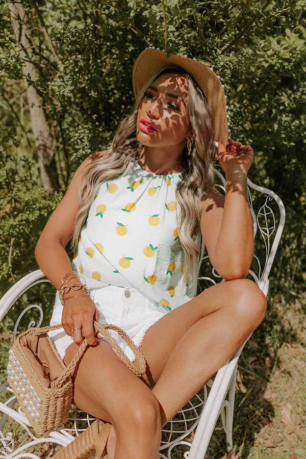 When life gives you lemons, make an adorable summer look out of them! Our charming white 'Fondly Favored Shift Top' features lightweight material patterned with a darling green and yellow lemon print, a high neckline, tie closure spaghetti straps, and a relaxed silhouette that falls into a straight hemline! on products