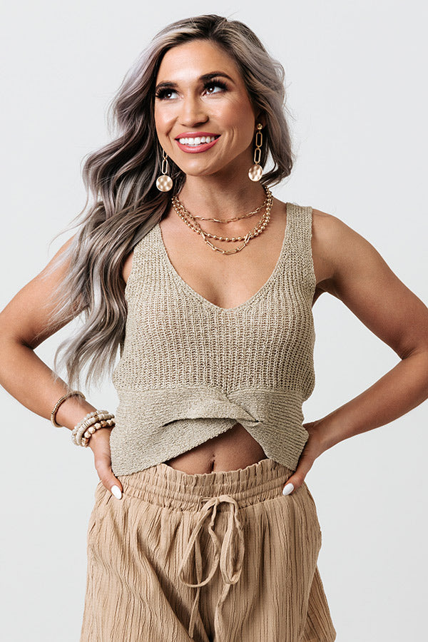 You are sure to feel luxe in this basic light sage colored tank featuring soft lightweight tight knit material, a v-cut neckline, wide sleeveless shoulder straps, a low square back, and a relaxed silhouette that ends in a cropped twisted front hemline and a straight back hem!