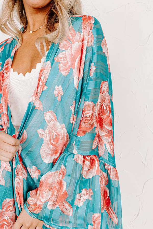 Who say's you can't wear layers in summer? Keep stylish in our pretty turquoise 'Forgotten Paradise' overlay featuring ultra lightweight material patterned with a large light peach hued floral print, oversized 3/4-length batwing sleeves, and draped open front silhouette that falls into a straight knee-length hemline! on products