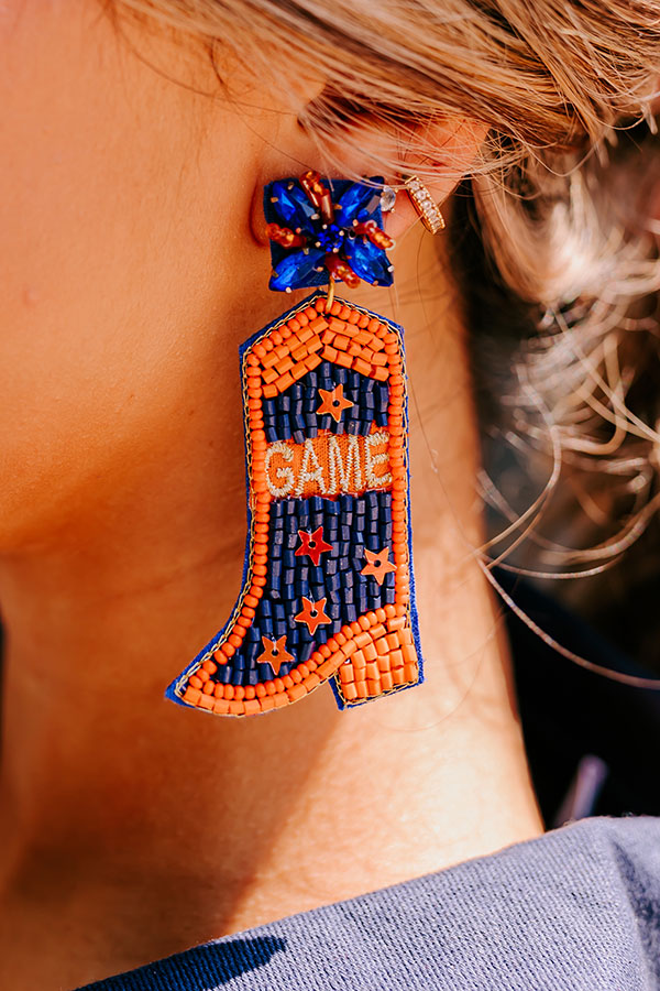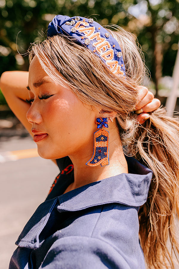 - Square studs with rhinestones as well as beading and a dangling beaded boot design featuring gold colored 'GAME DAY' embroidery and star accents