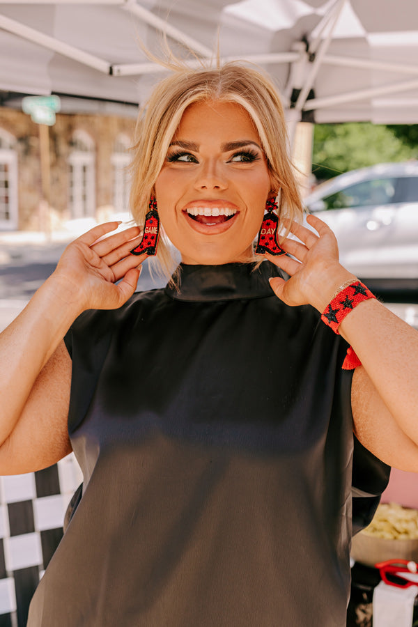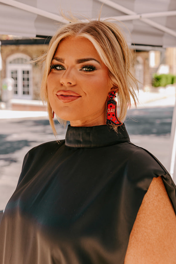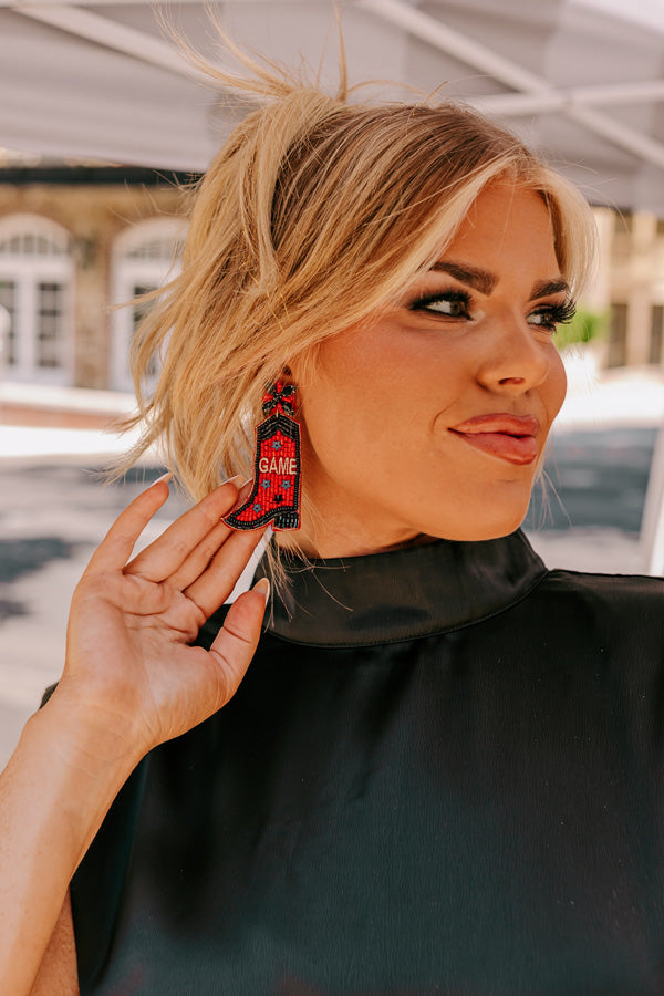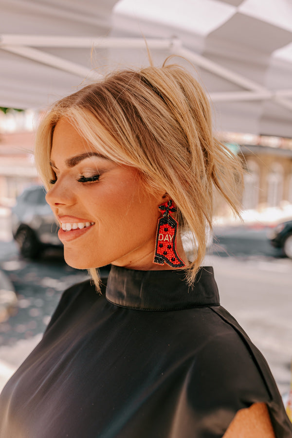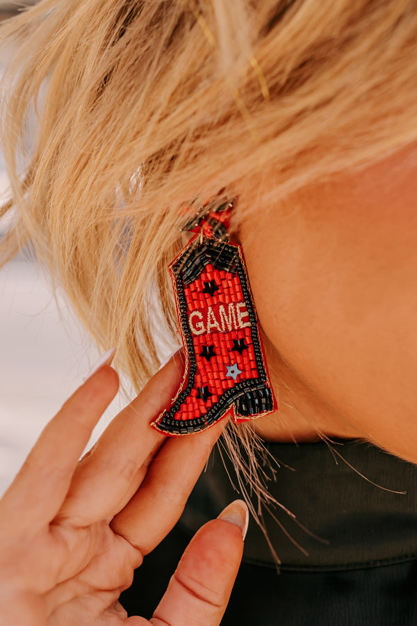 - Square studs with rhinestones as well as beading and a dangling beaded boot design featuring gold colored 'GAME DAY' embroidery and star accents