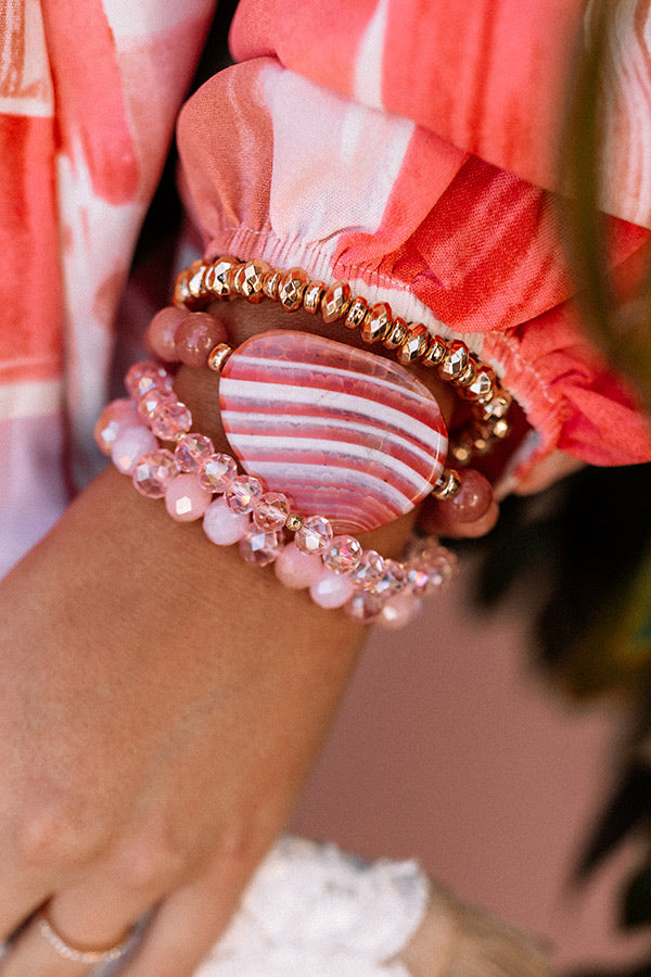Life's a party, so accessorize like it with this beautiful bracelet set featuring four stretch pieces with pink, clear, and gold beads and a large pink semi precious stone!