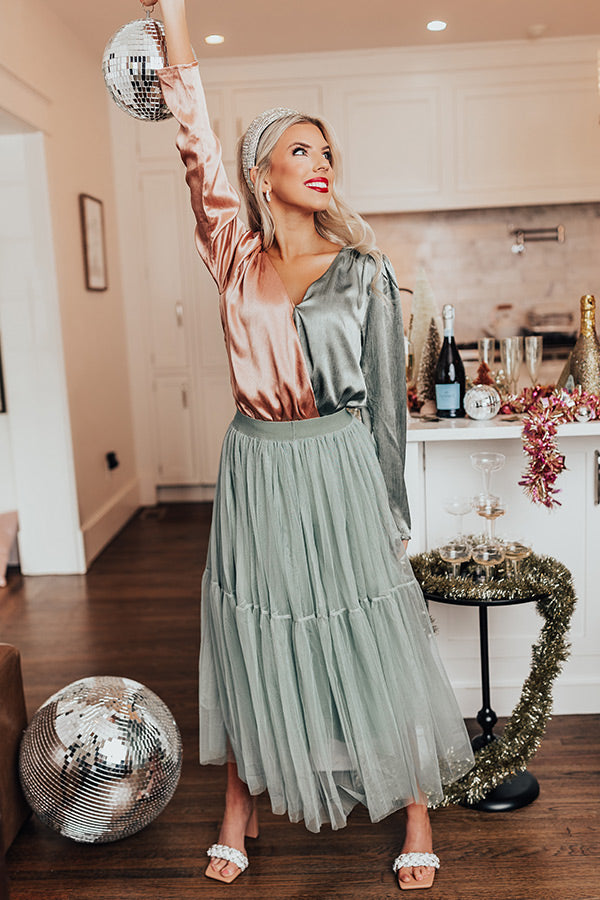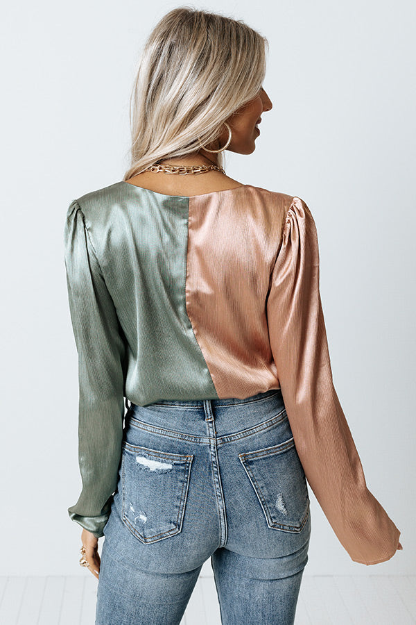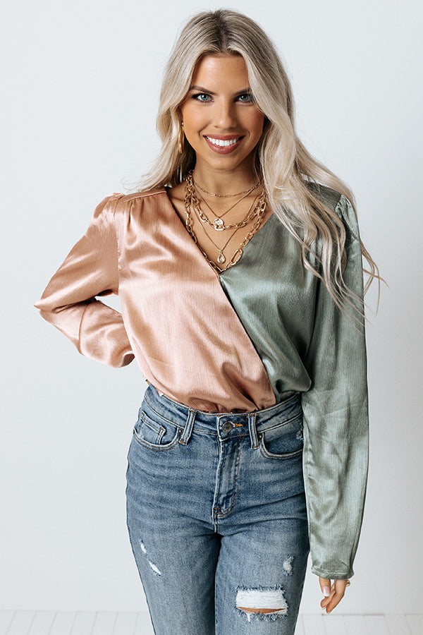 Dance to the beat of your own lovely little tune with this gorgeous bodysuit featuring lightweight satin material with one half being pear colored and the other half being taupe, a faux wrap bodice with a v-cut neckline, long loose sleeves, and a relaxed silhouette that ends in cheeky fit bottoms with a snap button closure!