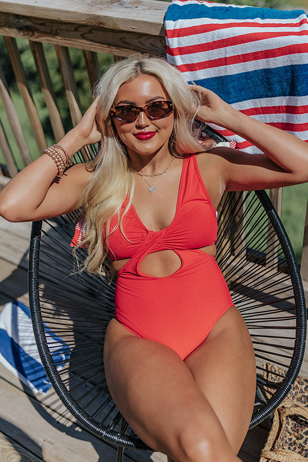 Turn up the heat this summer with this red hot one piece swimsuit featuring lightweight four-way stretch material, a scooped neckline with wide shoulder straps, a cutout midriff with a unique front detail and back detail, and a flattering figure hugging silhouette that ends in cheeky fit bottoms! This one piece swimsuit is not padded.