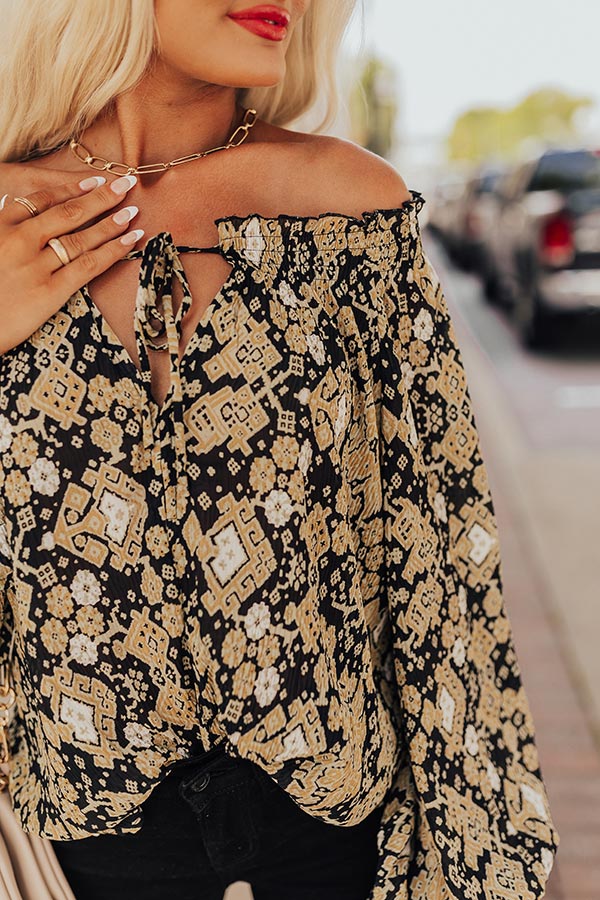 Slay all day in our charming 'Moody Vibes Shift Top' featuring lightweight material patterned with a pretty baroque print, a draped shoulder neckline with a tie closure, long bishop sleeves with subtly flared cuffs, and a relaxed silhouette that falls into a straight hemline!