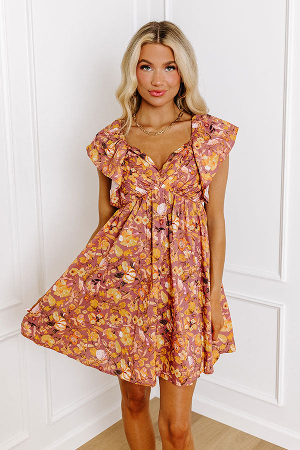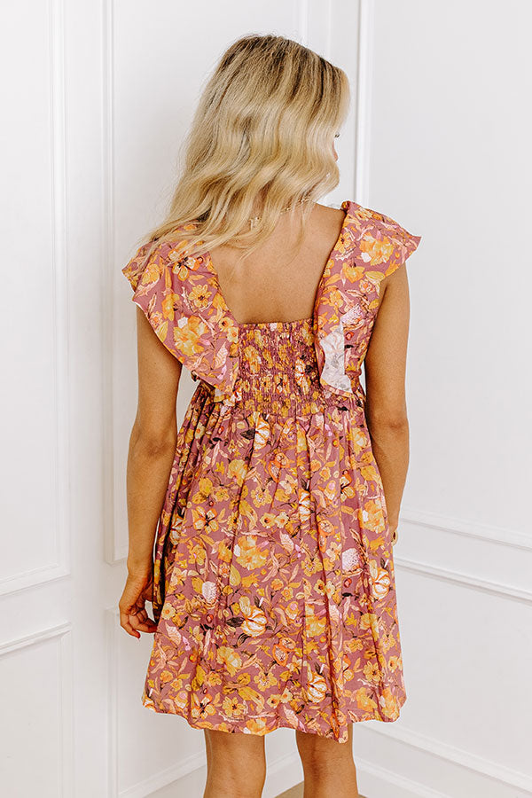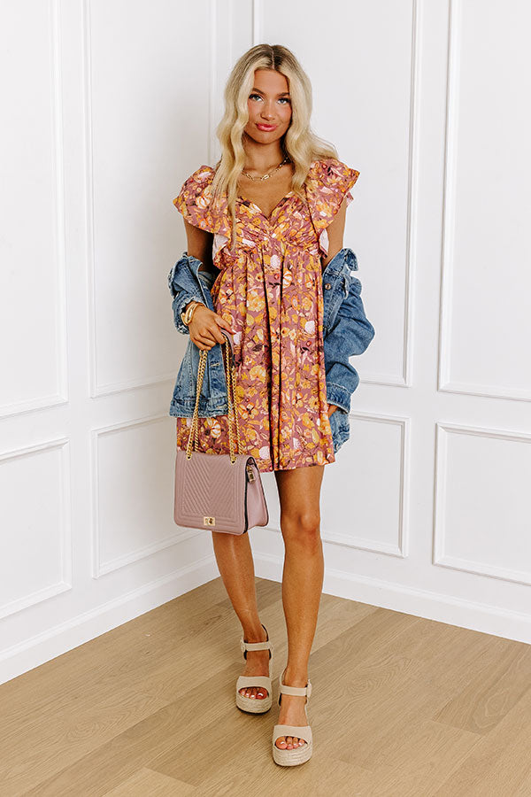 - Lightweight material with a orange and yellow hued floral print and a built-in lining