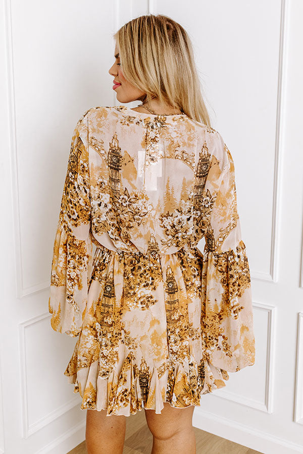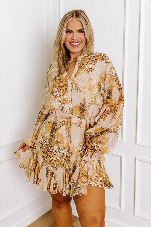 Welcome fall effortlessly with our stunning plus size 'On A High Note Shift Dress' featuring lightweight material patterned with a beautiful golden honey and ivory hued print, a button down front with a v-cut neckline, long loose sleeves with puffed forearms a cinched tie closure waistline, and a relaxed silhouette that falls into a ruffled mid-thigh length hemline!
