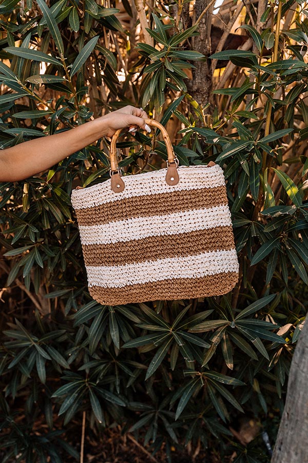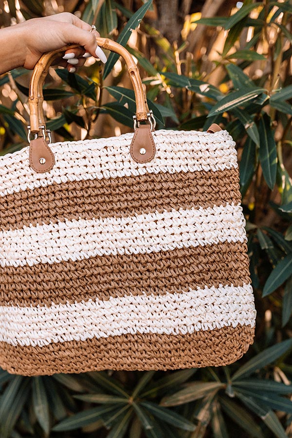 There is no better piece to take on vacay than our beautiful 'Ora Beach' tote featuring woven material with wide horizontal tan and ivory hued accent stripes, two rounded faux bamboo tote handles, and a spacious but lightweight pouch!