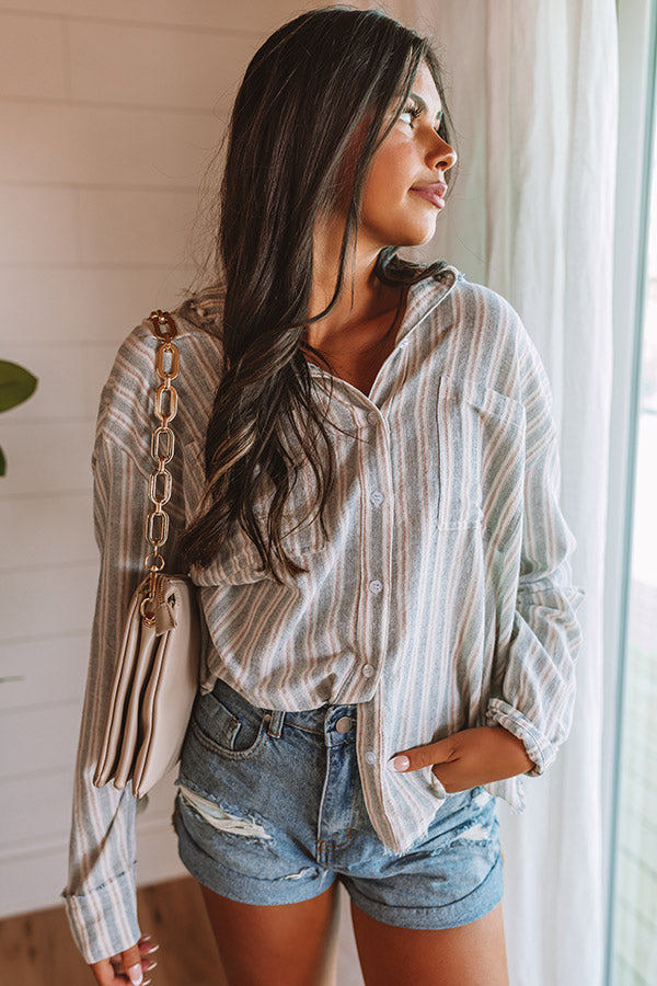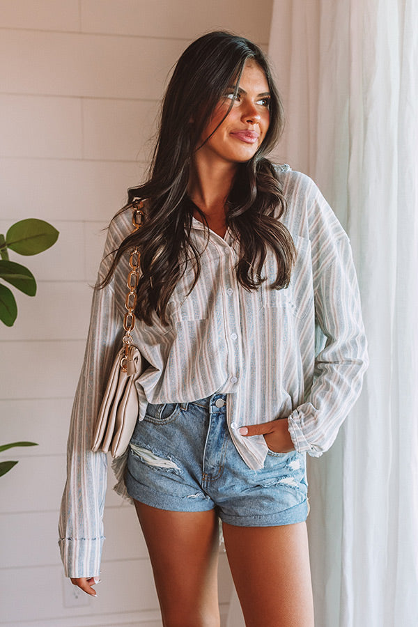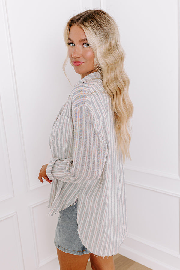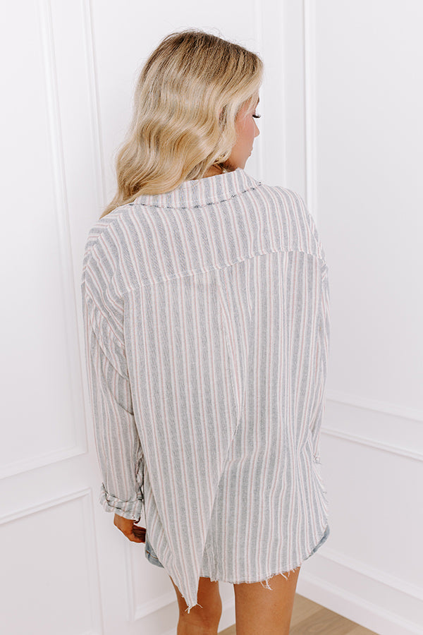 Get ready effortlessly with our classy white 'Out Of Line' top featuring lightweight material patterned with subtle vertical red pinstripes, a button up front with a collared neckline, long loose sleeves with button closure cuffs, two accent chest pockets and a relaxed silhouette that falls into a rounded hemline!