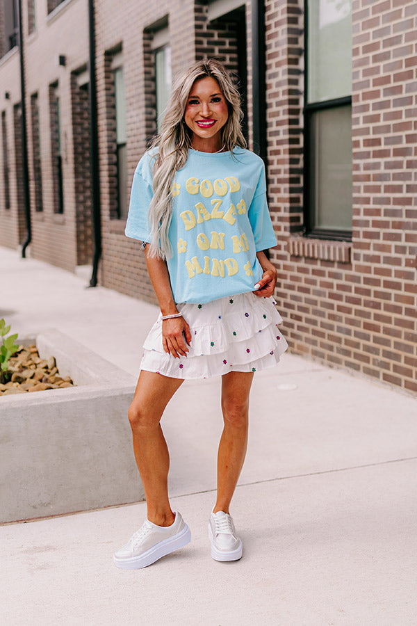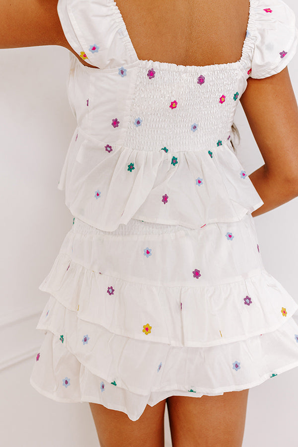 - A tired skirt silhouette that ends in a straight upper-thigh length hemline