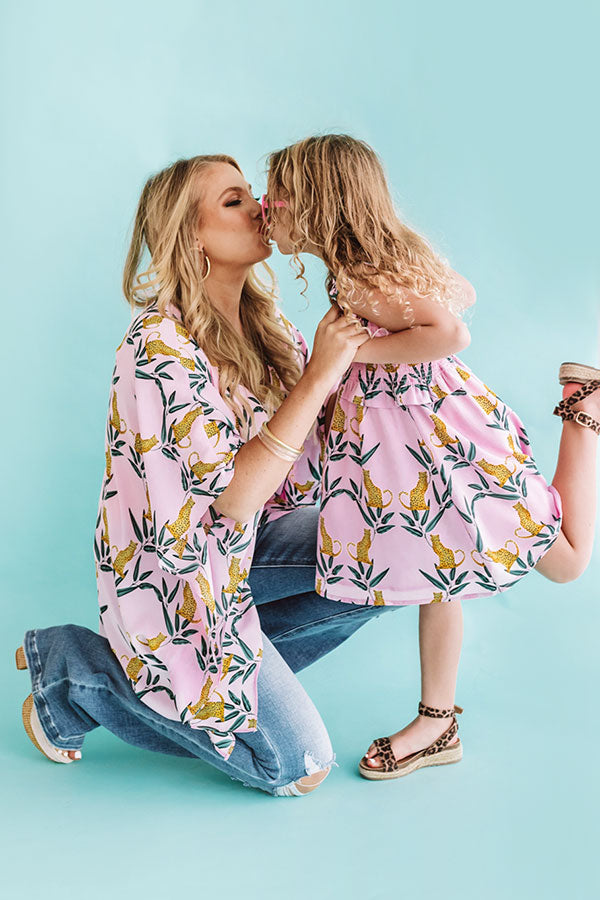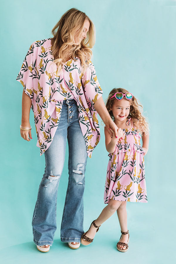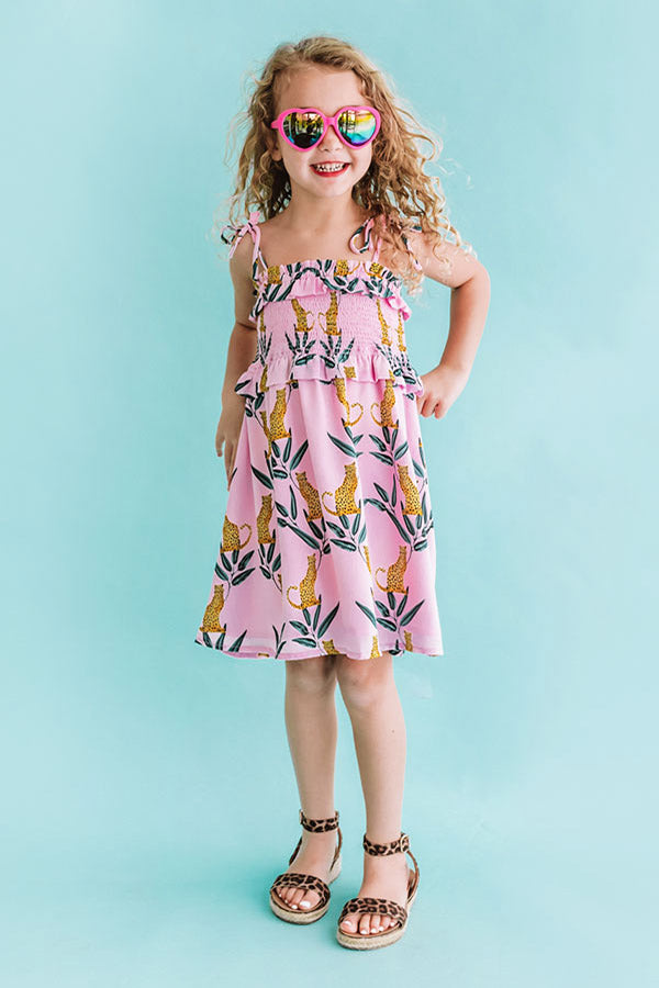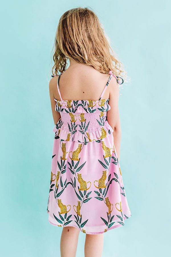 Get your mini me ready for "pools and palm trees" with this adorable pink dress featuring lightweight material patterned with a green palm leaf and cheetah print, a smocked bodice, a straight neckline with ruffled trim detailing, tied spaghetti straps, and a relaxed silhouette that falls into a straight knee length hemline!