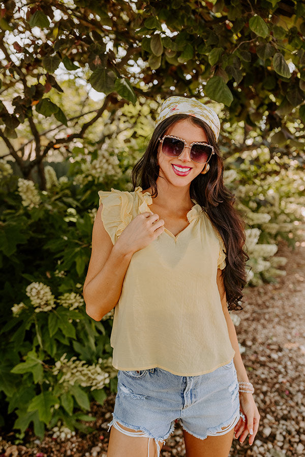 Slay all day in our charming yellow 'Prettiest Smile Shift Top' featuring lightweight material, a ruffled collar v-cut neckline, flirty ruffled cap sleeves, and a relaxed silhouette that falls into a straight hemline! on products
