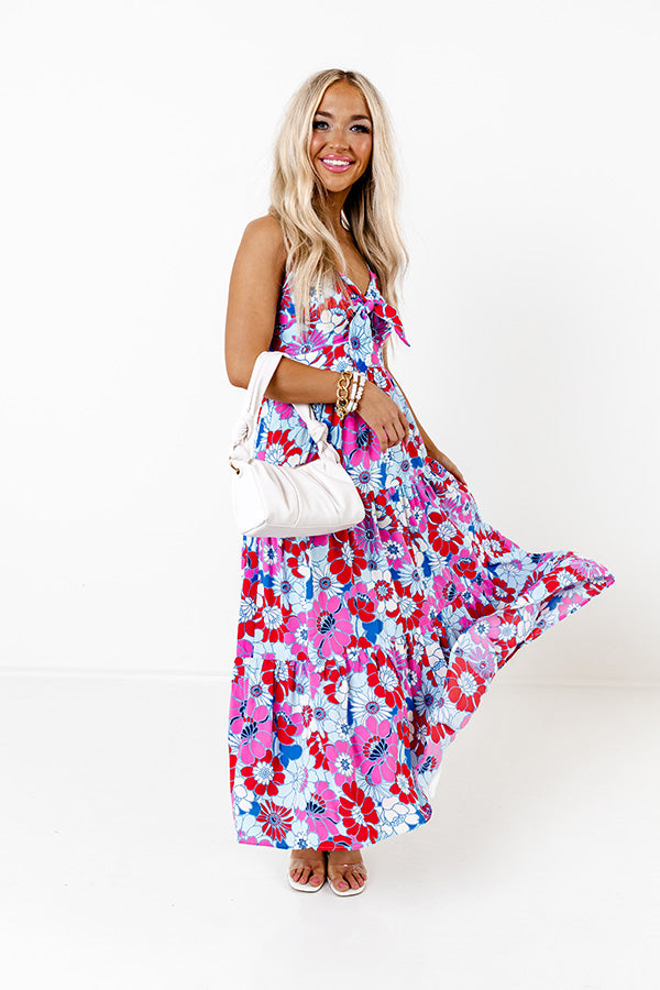 You will look so pretty and pleasant in this beautiful midi dress featuring lightweight material patterned with a red, light blue, pink, and royal blue floral print, a v-cut neckline with a front tie detail, adjustable spaghetti straps, and a relaxed silhouette that falls into a straight mid-calf length hemline! on products
