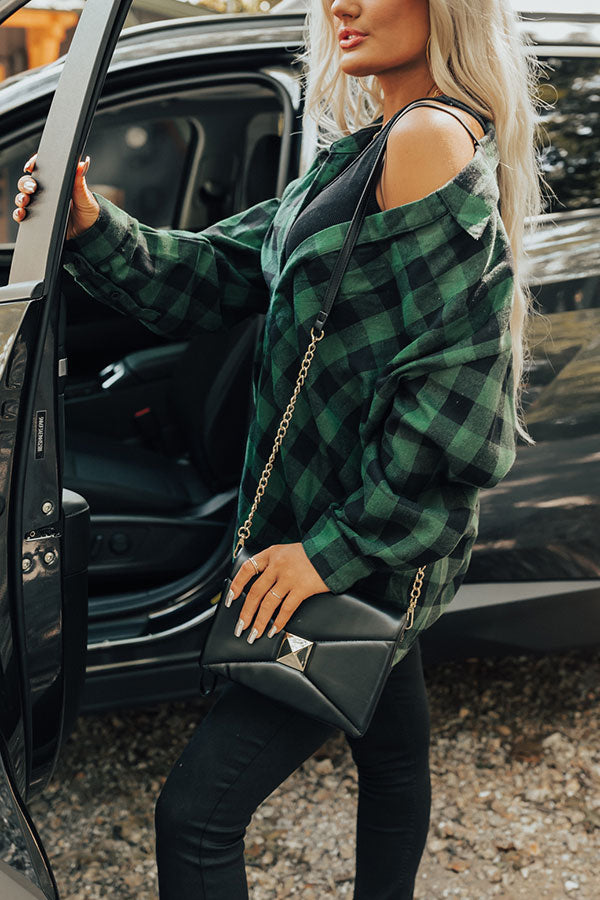 Our 'Ready to Romance' clutch is the perfect complement to any date night look! Features sleek faux leather in a black color, quilted texturing, an adjustable chain link shoulder strap, a flap/button closure, gold hardware, and two fully lined rectangular pouches.