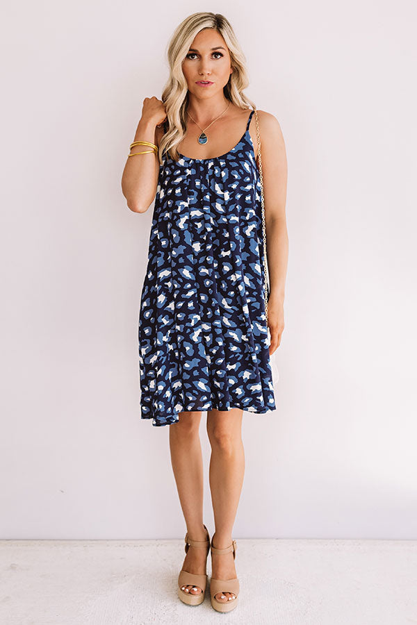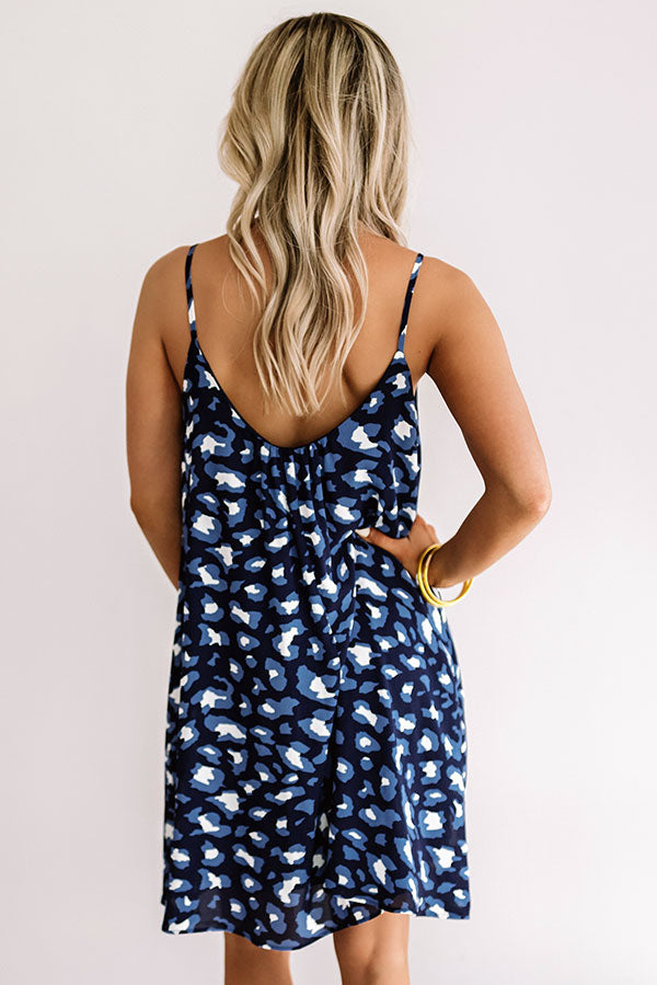 Step up your Saturday style with this navy shift dress featuring a bold leopard pattern, a scooped neckline, spaghetti straps with a low back, lightweight material, a knee length hemline, and a straight breezy fit! We have styled this adorable piece with some neutral wedges and a white transparent crossbody, but you can also pair it with "The Brynn Faux Suede Bootie in Light Stone" and "The Jonas Hat in Black" for multiple game day looks that will take you from tailgating to touchdowns!
