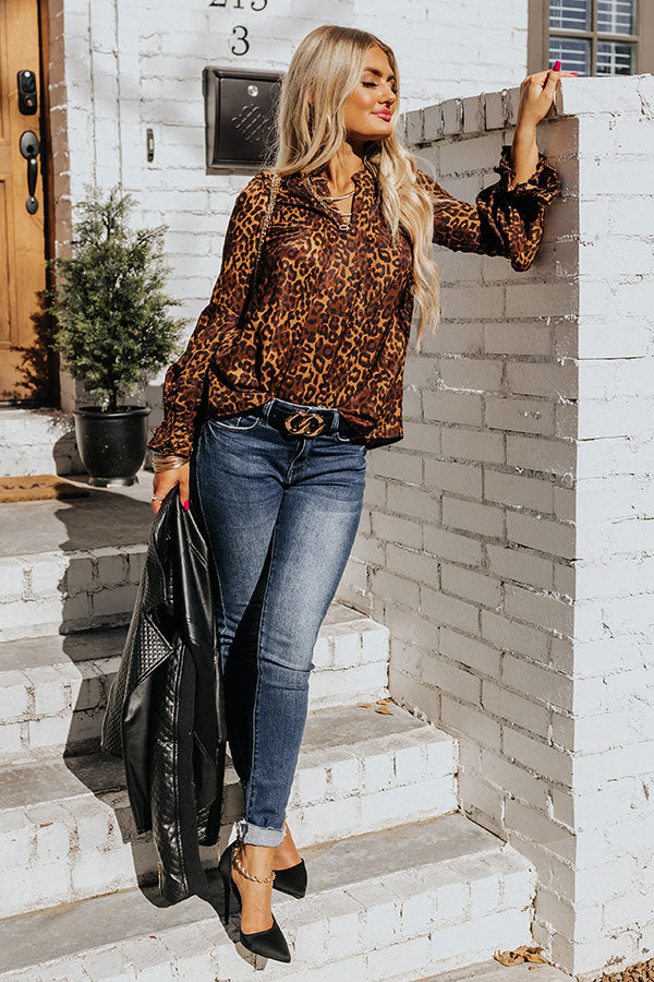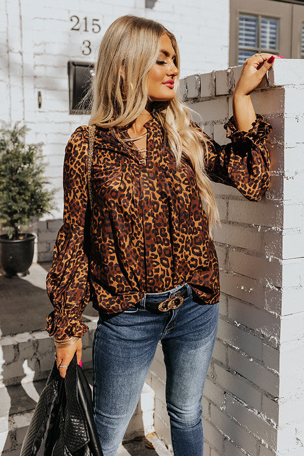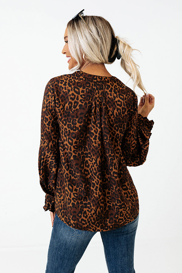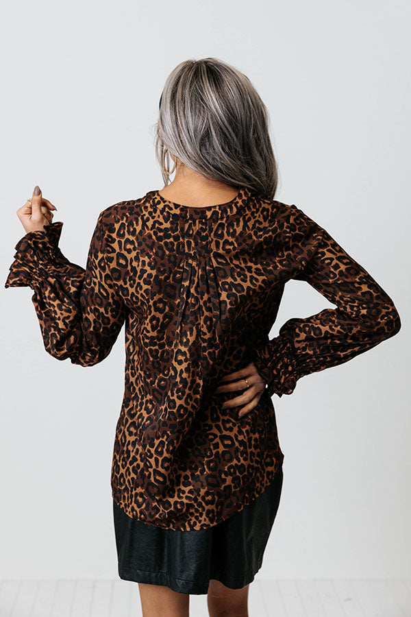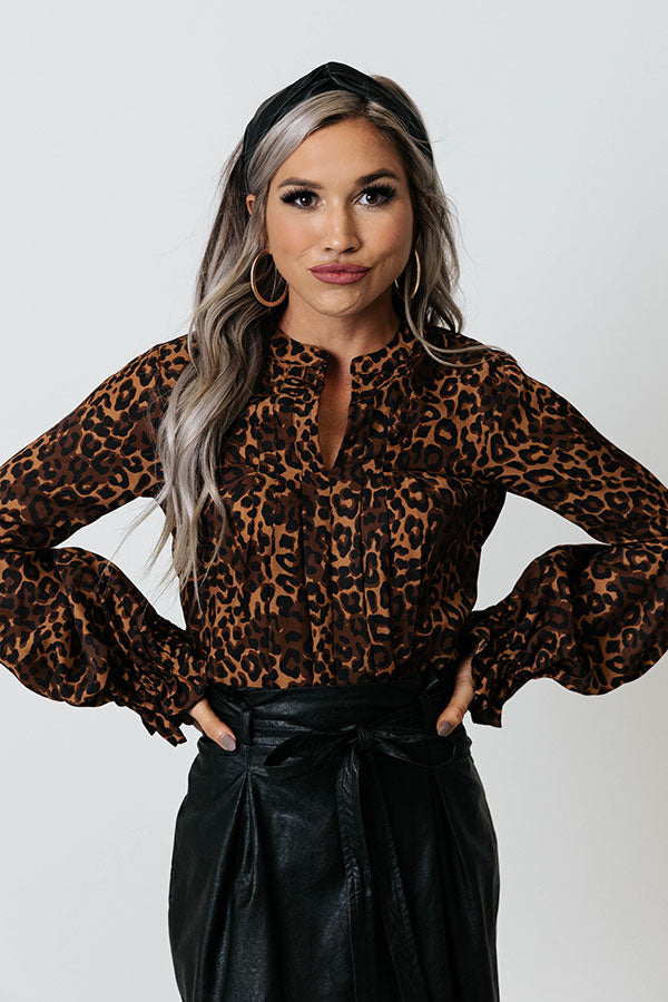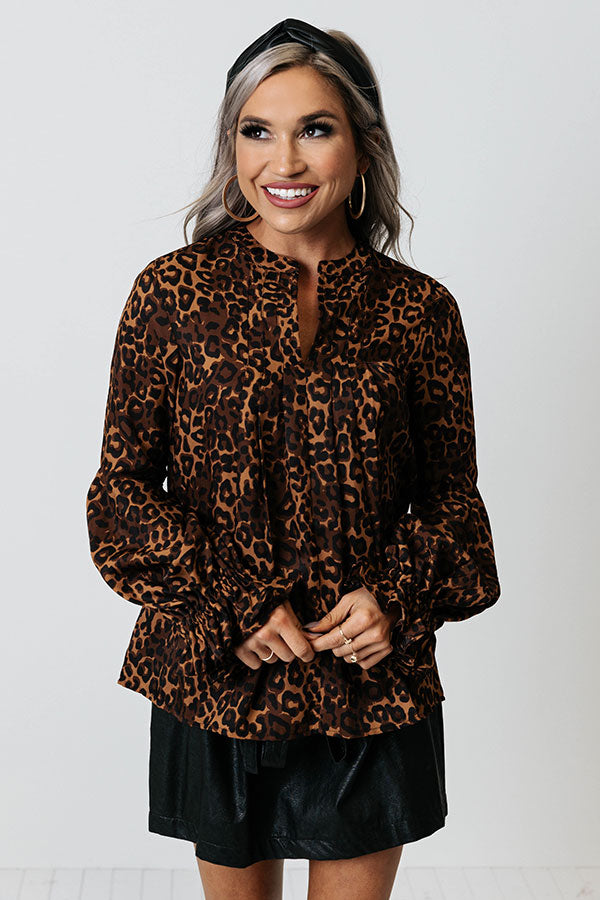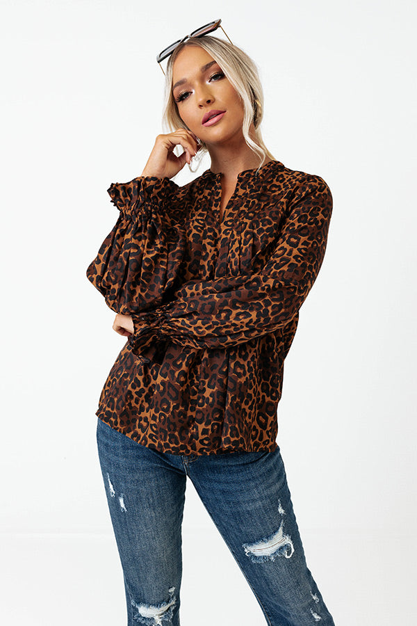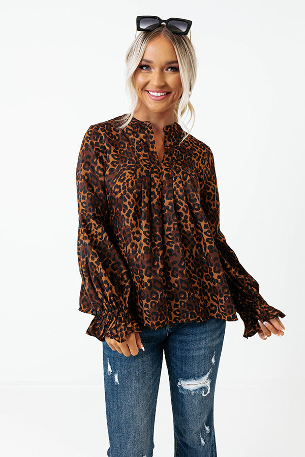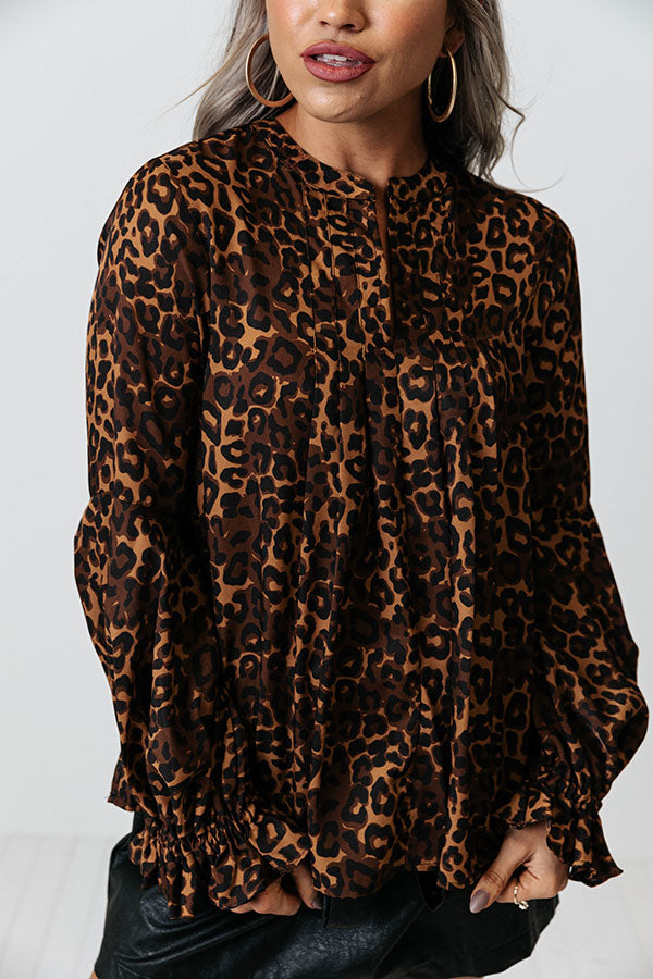 Your style will be flourishing when you complete your look with this beautiful camel hued shift top featuring lightweight material patterned with a brown and black leopard print, a rounded neckline with a v-cut notch, long bishop sleeves with ruffled cuffs, and a relaxed silhouette that falls into a straight hemline!