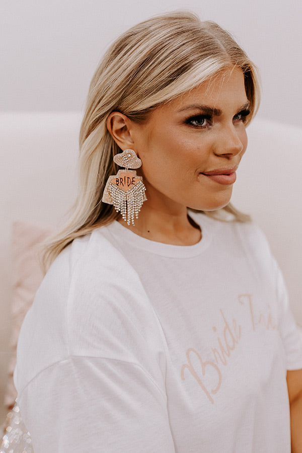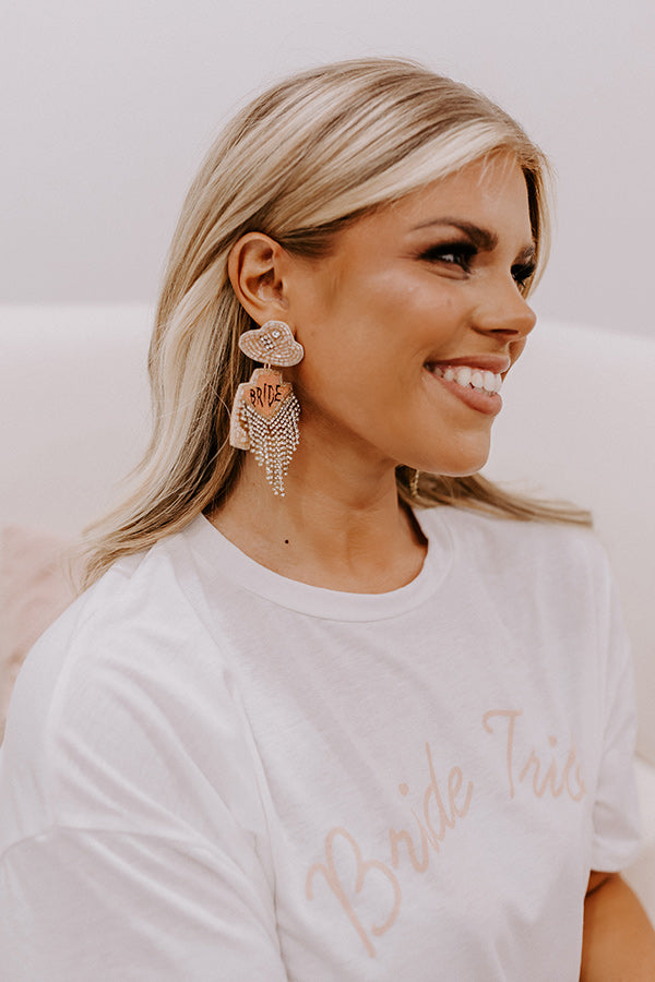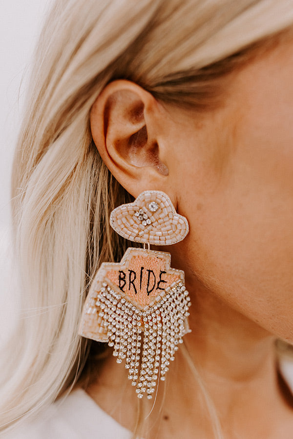 - Peach colored beaded earrings with cowboy hat studs and dangling TEAM BRIDE jacket design with rhinestone accents