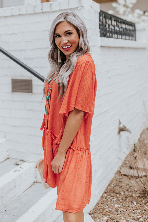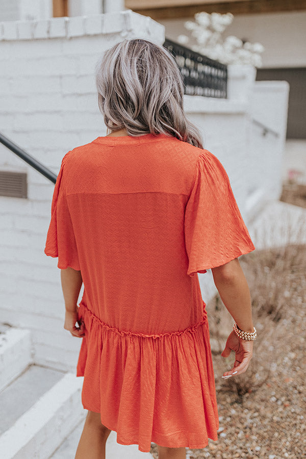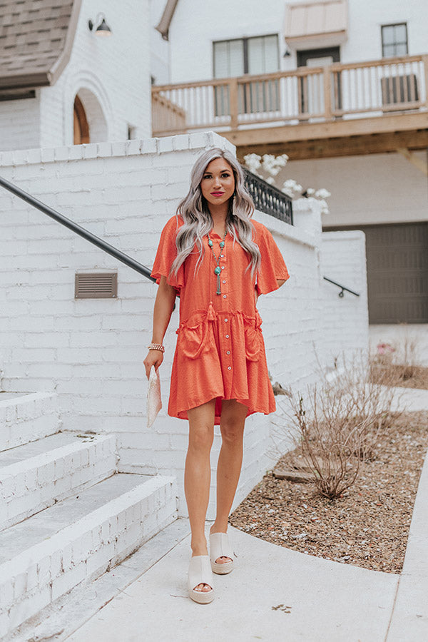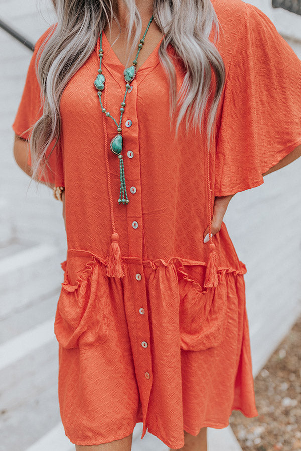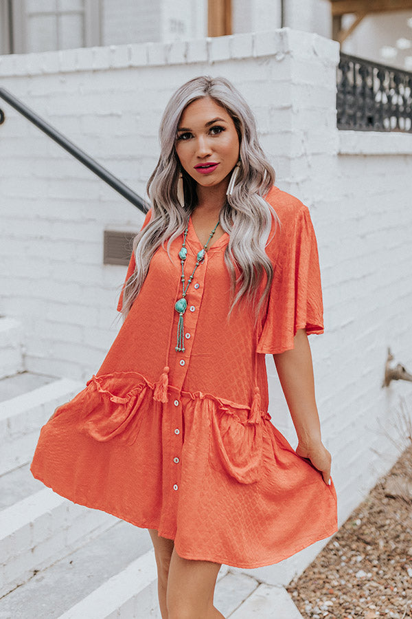 You are sure to be the star of the story when you wear this adorable tangerine hued shift dress featuring lightweight flowy material patterned with a subtle diamond print, a button down front with a v-cut neckline, short draped sleeves, accent front pockets with ruffled trim detailing, and a relaxed silhouette that cascades into a peplum bottom with a straight mid-thigh length hemline!